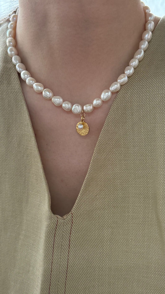 Gardener’s Grace Baroque Freshwater Pearl Necklace with Gold Coin Charm