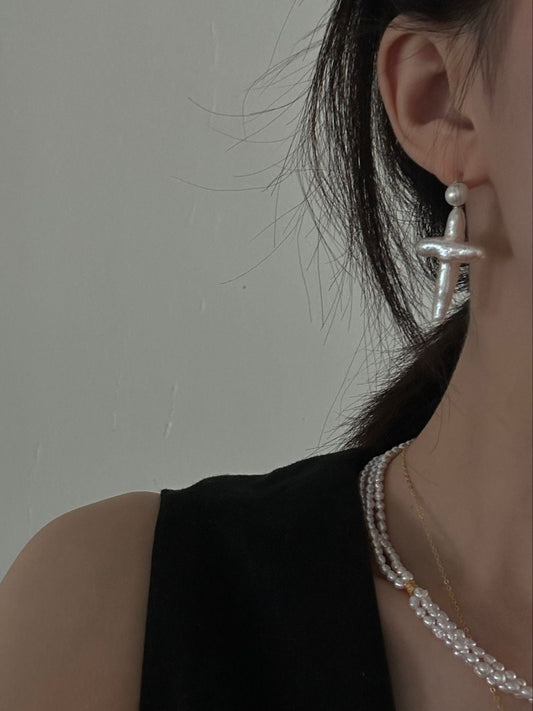 Crossbeam Baroque Freshwater Cross Studs in Sterling Silver
